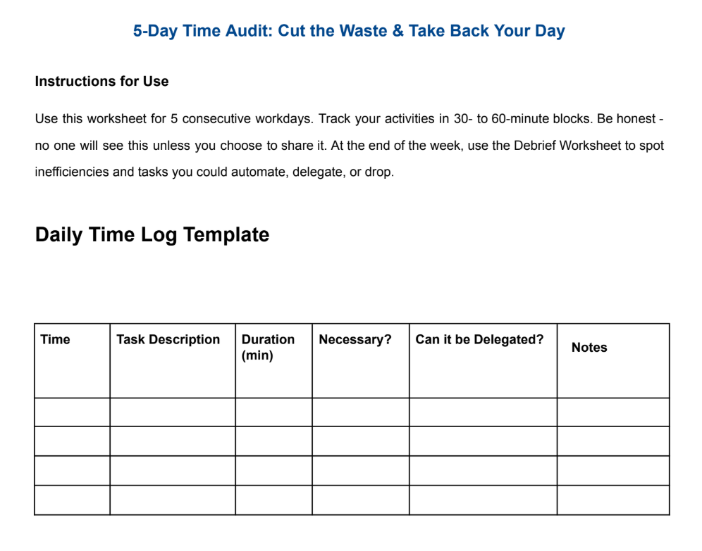 - 5-Day Time Audit + Delegation Matrix